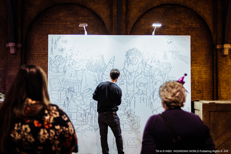 Adding to the event's charm was the presence of Warwick Davis, who enthusiastically contributed suggestions to the artist—predictably including a request to feature Professor Flitwick, the character he portrays in the film series.