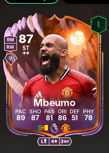 Bryan Mbeumo's Ultimate Scream card emerges as a formidable Striker, boasting an impressive overall rating of 87. This card capitalizes on his blistering 89 pace and sharp 87 shooting, complemented by 86 dribbling and 81 passing. As a striker, his exceptional speed and clinical finishing make him a constant threat in behind defensive lines, allowing you to swiftly dismantle the opposition's defense. With his ability to seize upon any half-chance, Mbeumo is the perfect weapon to score decisive goals and seal victory in crucial moments of the game.