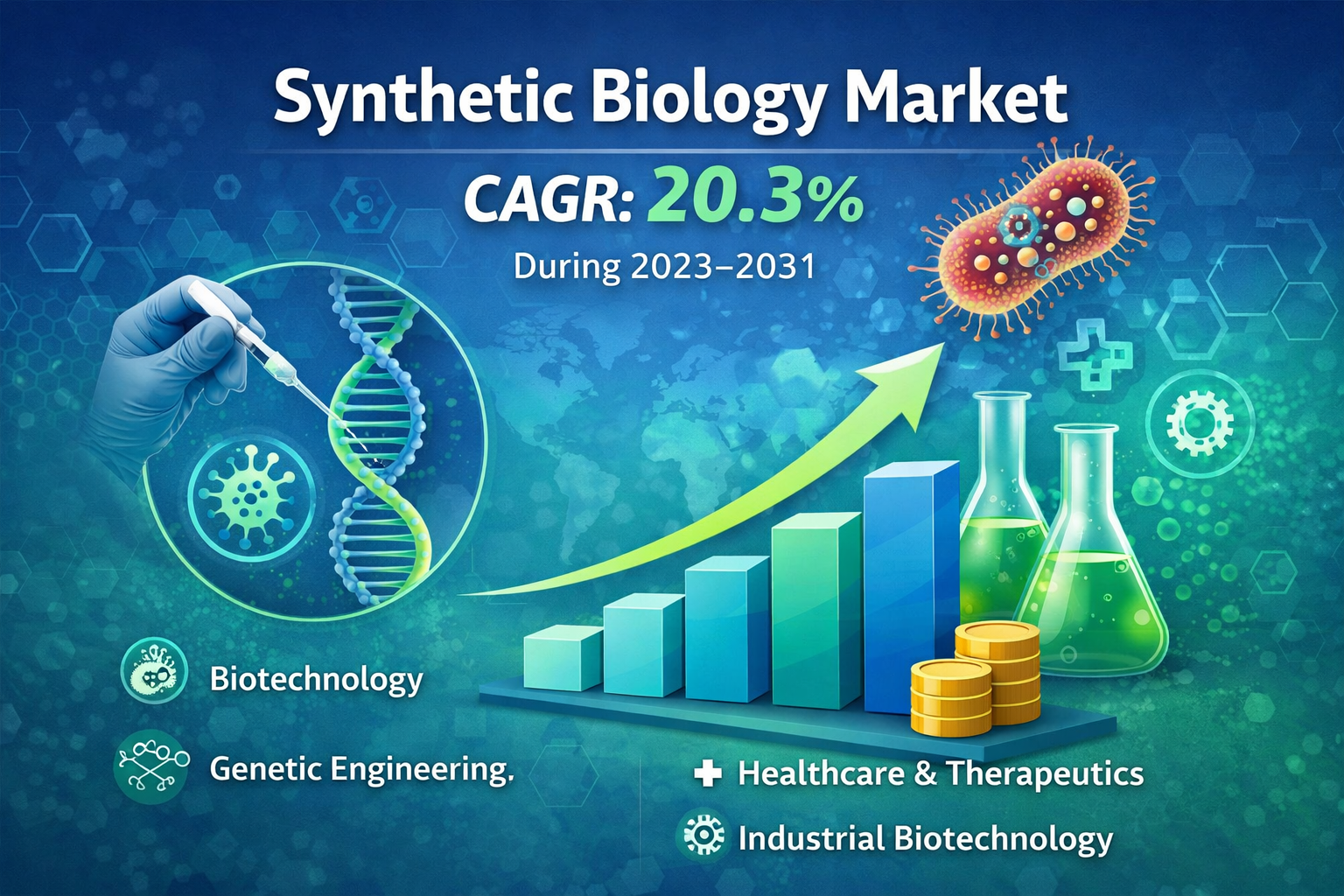 The Global Synthetic Biology Market is undergoing transformative growth, driven by advancements in genetic engineering, rising demand for sustainable bio-based products, and increasing investments in biotechnology research. Synthetic biology integrates engineering principles with biological systems to design and construct new biological entities or redesign existing ones for useful applications across healthcare, agriculture, industrial manufacturing, and environmental management. According to industry insights, the Synthetic Biology Market was valued at US$15.1 billion in 2023 and is projected to reach US$66.4 billion by 2031, registering a remarkable CAGR of 20.3% during 2023–2031. This strong growth trajectory is fueled by increasing adoption of gene synthesis, genome engineering, and bioinformatics tools, along with the rapid expansion of biotech startups and research initiatives worldwide.